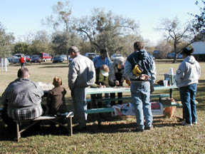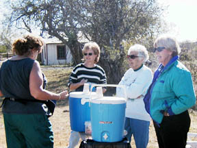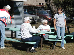 The walk looped back past the start and I stopped for a bathroom break. Carol stopped to chat with Elaine and Lyn who were drinking coffee at a picnic table |